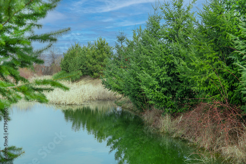 Small garden pond with young spruces evergreens on shore are reflected in water surface