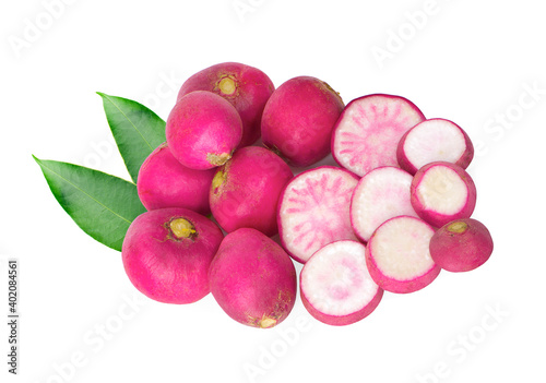 Small garden radish and slices an isolated on white background