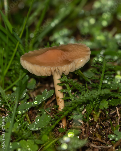 Small orange mushrooms emerging from lush, dew-covered grass in a natural setting