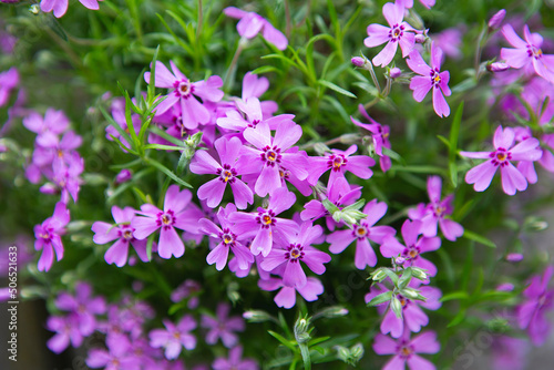 Small purple flowers with green leaves. internet springtime banner. Spring floral background. Spring flowerbed with lilac flowers