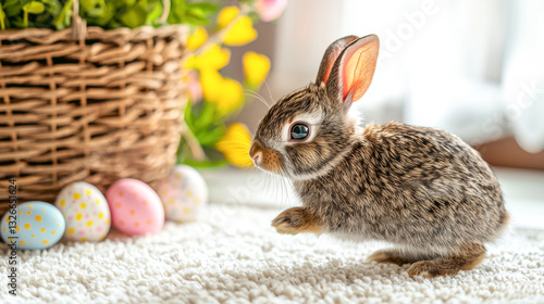 Small rabbit hopping on white carpet with easter eggs near basket. concept of Easter bunny, cute pet, spring festivity, home decor