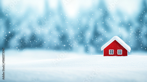 small red house stands alone in snowy landscape, surrounded by softly falling snowflakes. scene evokes sense of tranquility and winter beauty