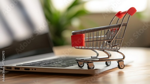 Small Shopping Cart on Laptop Keyboard Representing Online Shopping and E-commerce Concepts with a Background of Natural Light and Indoor Plants
