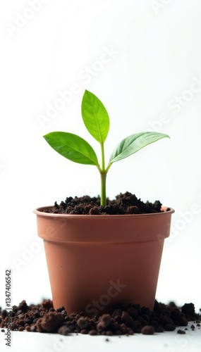Small sprout emerging from soil in pot on white background, growth, stem
