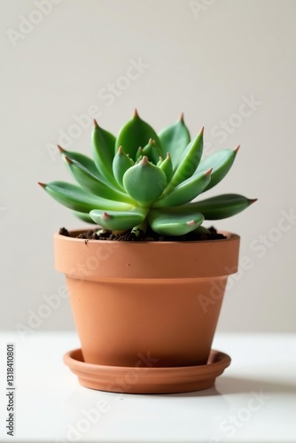 Small succulent plant in terracotta pot on white surface, round, plant, pot