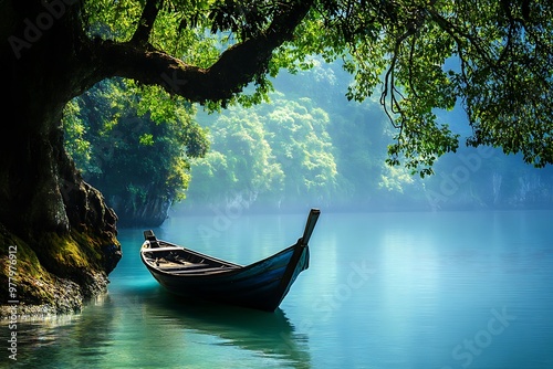 Small wooden boat on calm blue water lake with green lush foliage and large tree in the background. Serenity and peace concept.