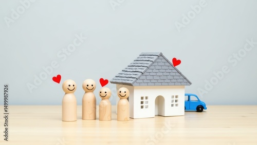 Small wooden figurines of a family in front of a miniature house.