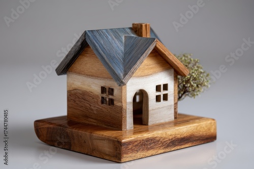 Small wooden house model placed on a smooth surface with realistic features and mini tree in a soft-lit indoor setting