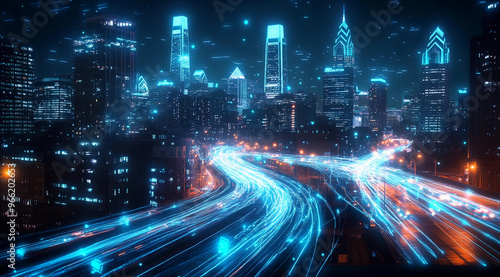 Smart City Digital Transformation concept: Network Connection, Smart Buildings, and IoT Integration with 5G
