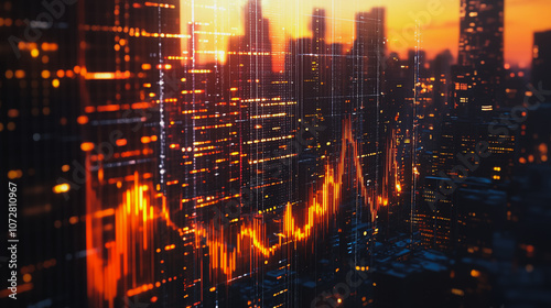 Smart digital Innovation Business skyscrapers in the Financial District with connection network reciprocity over the cityscape. of future smart wireless digital city and social media networking