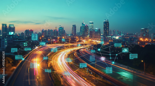 Smart Innovation city with connection cyber security network reciprocity over the night cityscape future wireless digital city and social media networking systems that connects people in the city