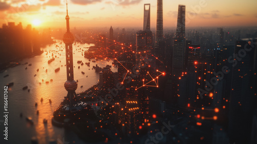 Smart Innovation city with connection cyber security network reciprocity over the sunset cityscape future wireless digital city and social media networking systems that connects people in the city