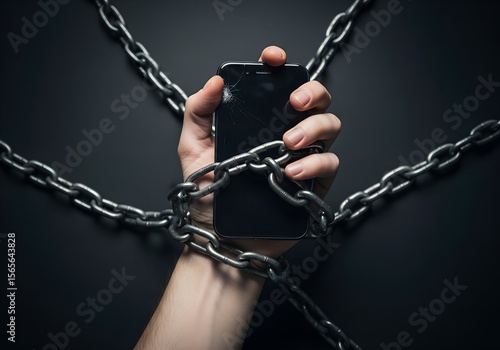 Smartphone chained to human hand, digital addiction concept, internet obsession, social media overuse, tech dependence, screen time control