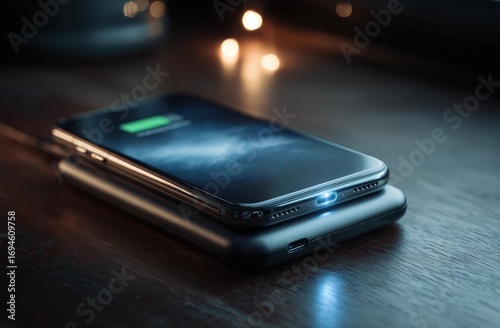 Smartphone charging on a dark wooden surface