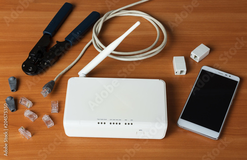 Smartphone, components for connecting a router and a crimper, on table