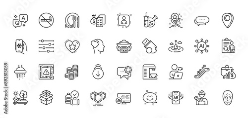 Smile chat, Augmented reality and Flash memory line icons pack. AI, Question and Answer, Map pin icons. Developers chat, Fishing float, Repairman web icon. Vector