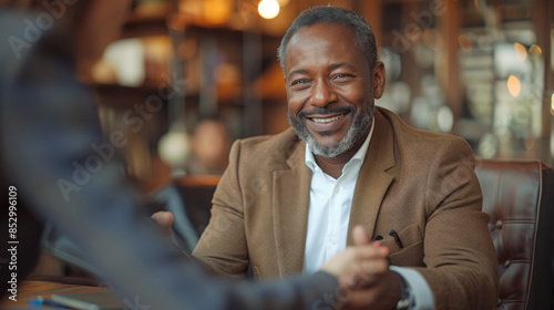 Smiling African American manager sitting at his desk in an office shaking hands with a job applicant after an interview