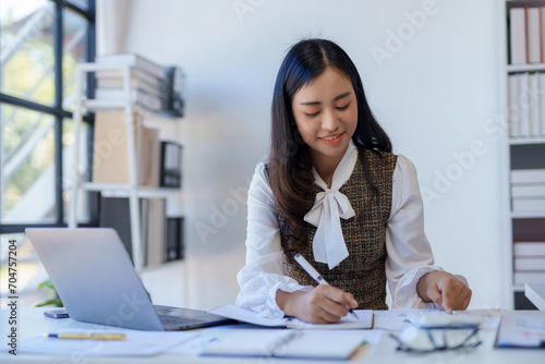 Smiling asian business woman accountant analyst holding documents, work at laptop computer doing online trade market tech research.