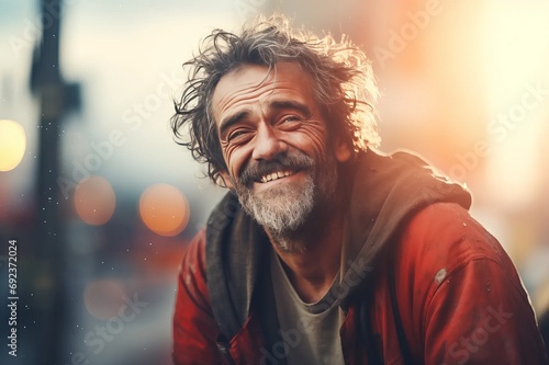 Smiling bearded homeless against street background
