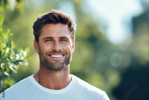 Smiling bearded man in white t-shirt outdoors in natural light. Confident and friendly portrait with greenery background. Happiness and positivity
