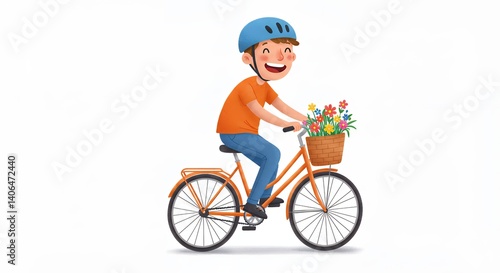 Smiling boy on a bicycle with flowers in basket
