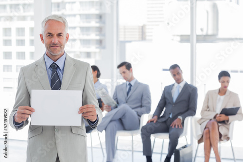 Smiling businessman holding a blank sign