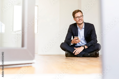 Smiling businessman sitting on the floor with cell phone