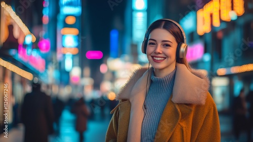 Smiling Caucasian Woman Wearing Headphones Walks Through Neon-Lit City Street at Night