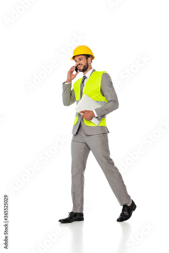 Smiling engineer in hardhat and suit talking on smartphone and holding laptop on white background