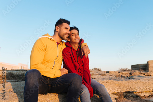 Smiling father with arms around neck of son looking away while sitting on rock