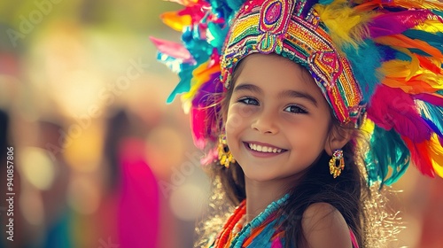 Smiling girl in traditional colorful headdress at a vibrant festival