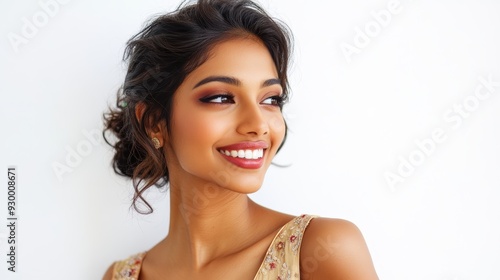 smiling Indian woman exudes confidence in a casual tank top, t-shirt and bikini style, set against a bright, airy white background, perfect for summer themed visuals.