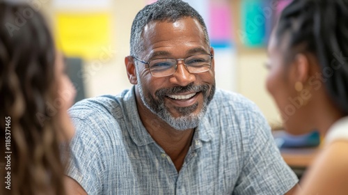 Smiling man engaged in conversation with two women