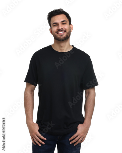 Smiling man in black t-shirt on white background