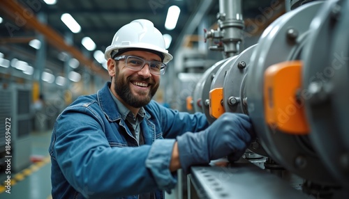 Smiling man in hard hat works on industrial machinery in factory. Technician performs maintenance on plant equipment. Male engineer happy at manufacturing workplace, blue collar job.