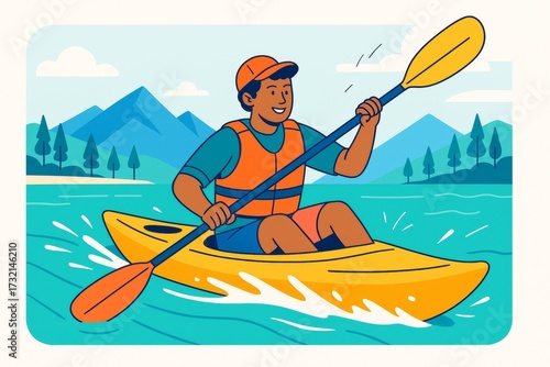 Smiling man kayaking on turquoise lake with mountain and forest background in creative colorful light illustration style. Ai generative. Ai generative