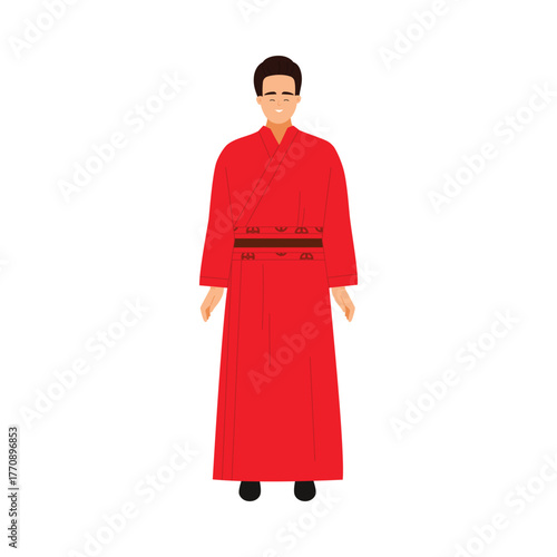 Smiling man wearing traditional Hong Kong red robe isolated on white background vector illustration