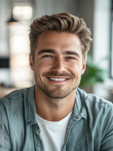 Smiling Man with Beard and Short Hair in Casual Clothes at Interior Location