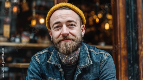 Smiling Man with Yellow Beanie and Beard in Cozy Cafe Setting