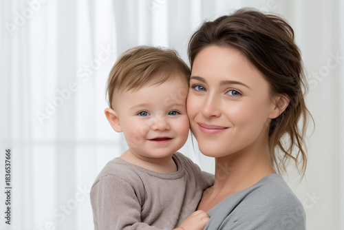 Smiling mother holding baby in bright home family love parenting and happy childhood lifestyle