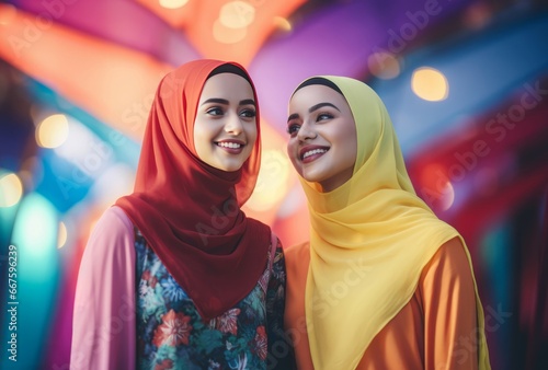 Smiling Muslim women in colorful clothes. Arabic girl wearing hijab headscarf. Generate ai