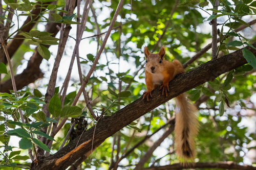 Smiling red squirrel with fluffy tail looking into camera while sitting on tree branch in summer woodland park outdoors