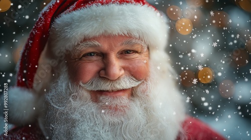 Smiling Santa Claus in Classic Red Hat Surrounded by Snowflakes, Spreading Joy and Holiday Cheer in a Magical Christmas Setting