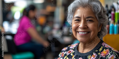 Smiling senior hispanic woman in hair salon, generative AI