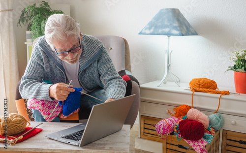 Smiling senior man enjoying knitting at home following online knit tutorial to relax and enjoy leisure activity sitting on armchair - male people knitting with computer class help