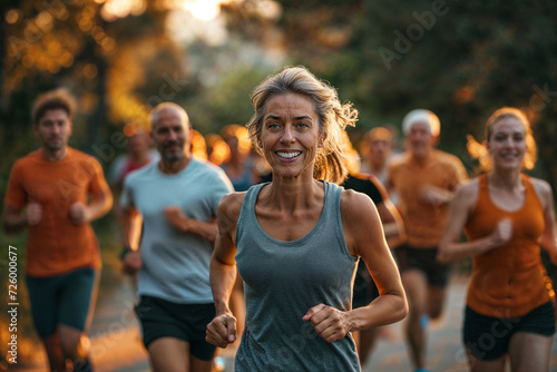 Smiling seniors and youths run outdoors in sports clothing.