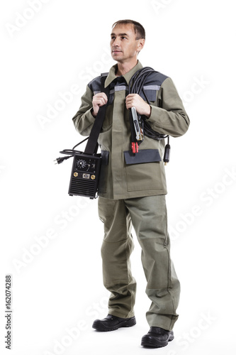 Smiling welder in overalls, with cable and welding machine in hands