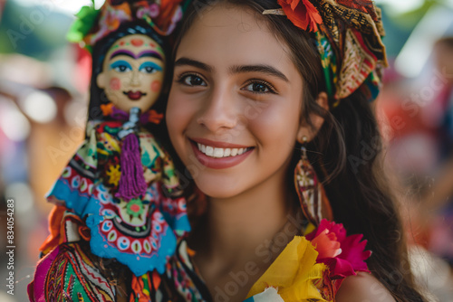 Smiling woman with a doll wearing a colorful traditional dress and a decorated straw hat. Festive and cultural theme. Design for banner with copy space, poster, and invitation.