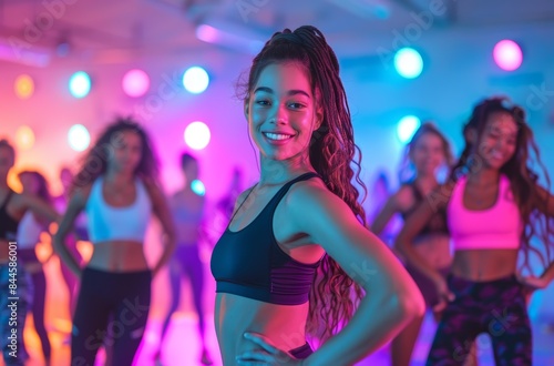 Smiling woman in fitness class with neon lights, joyful and energetic, group background