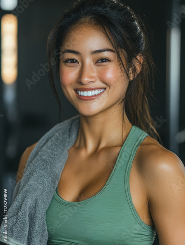 smiling woman in her late 20s at gym, wearing green tank top and holding towel, exudes confidence and energy. dimly lit background highlights her focus and determination